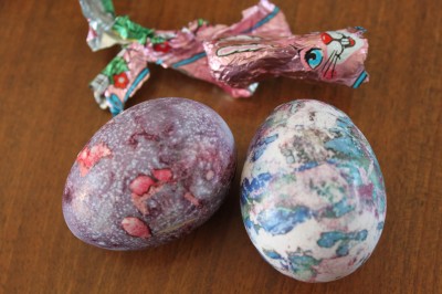Als Herr Nipp auf seinen Frühstückstisch blickte, konnte er zwischen den Silberpapieren von bereits verzehrten Osterhäschen und Krokanteiern doch tatsächlich noch zwei echte Ostereier entdecken, liebevoll vom Huhn gelegt, die mit einer ganz besonderen Technik gestaltet waren. Sie wirkten wie marmoriert. Er bewunderte sie eingehend, hatte schon fast das Gefühl, sie seien zu schade zum Essen, doch da meldete sich mit knurrender Eifersucht sein Magen.